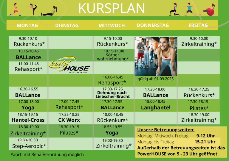 Das bodyHOUSE ist mehr als ein Fitnessstudio – es ist dein Partner für nachhaltige Gesundheit und Fitness. Mit einem umfassenden Angebot von Krafttraining über viele verschiedene Kurse bis hin zu Rehasport, deckt das bodyHOUSE alle Bereiche ab, die du für ein gesundes Leben brauchst. Genieße nach dem Training unsere Sauna, um Körper und Geist wieder in Einklang zu bringen. Lassen Sie sich von einem Lebensstil begeistern, der ein Höchstmaß an Gesundheit und Lebensfreude beinhaltet.